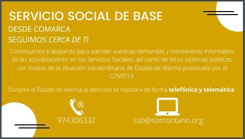 El Servicio Social de Base es la puerta de entrada al sistema Público de Servicios Sociales, uno de los pilares básicos del Estado del Bienestar. Es el servicio más cercano al ciudadano, abierto a toda la población, para buscar y/o dar respuesta a las necesidades y demandas sociales de personas, familias y colectivos. El objetivo fundamental es procurar un nivel digno de bienestar y calidad de vida a los habitantes del Somontano.